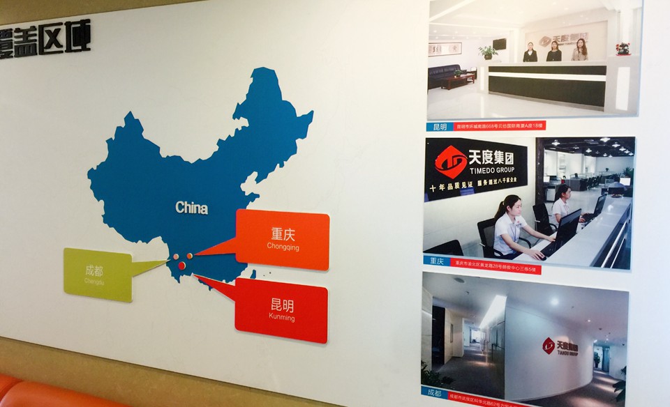 再往里走就到了“覆蓋區(qū)域”文化墻,主要內(nèi)容是展示重慶、昆明、成都三個總部地址。